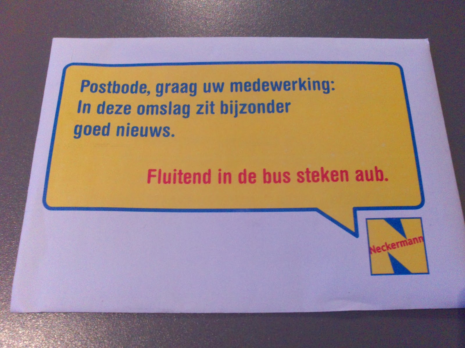 Stel je voor dat je een cadeau wil verzenden naar een klant, zou je het dan inpakken in verfrommeld krantenpapier? Nee, de kans is groot dat je het met veel zorg zal inpakken. Als je daarentegen een brief verzendt naar een klant, dan vindt bijna iedereen het plotseling de normaalste zaak van de wereld dat er een standaard witte ziekenhuisenvelop uit de schuif wordt gehaald of eentje die bol staat van de schreeuwerige commerciële teksten. Gelukkig zijn er bedrijven die wat meer creativiteit door de gleuf van hun klanten willen persen. Neem nu deze envelop voor een glazenwasserij of de onderstaande mailing die ik van Neckermann in mijn brievenbus kreeg. Je zou voor minder zelf beginnen meefluiten.
